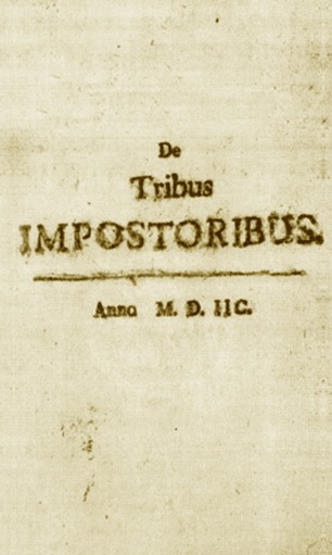 vor unvordenklichen zeiten stellte ein kluger sultan dem weisen nathan eine frage, die dieser mit einem gleichnis beantwortete. als schlussfolgernde zusammenfassung spricht ein weiser richter den Satz:| Ein Herausgeber (Emil Weller) schreibt in dem Vorwort zur zweiten Auflage der Schrift im Jahre 1876 : Die berühmte Schrift, welche ich bereits im Jahre 1846 der Oeffentlichkeit [Nebst deutscher Uebersetzung, der einzigen, welche es meines Wissens gibt.] übergab, ist ein Abdruck eines gedruckten Exemplars der Dresdner königlichen Bibliothek, welches den Titel fuhrt: "De tribus impoetoribus, Ao. MDIIC." (Titel und 46 Seiten 4.) und seiner Zeit mit 100 Gulden bezahlt wurde. Ebert in seinem bibliographischen Lexicon meint, dass man nur drei Exemplare dieser Originalausgabe kenne : in der Pariser damals königlichen Bibliotheken der ehemaligen Crevenna'schen und in der von Renouard. Dass sie wirklich 1598 in Deutschland (oder in Rackau) gedruckt worden ist, darauf lässt Thomas Campanella schliessen, wenn er in seinem Atheismus triumphatus 1636 zu wiederholten Malen von einer in Deutschland gedruckten Ausgabe spricht und als die Zeit ihres Entstehens das Jahr 1538 angibt; weniger Florimond Raimond (d. i. Louis Richeome), der sie bei seinem 1572 verstorbenen Lehrer Peter Ramus gesehen haben will. All das Gerede theologischer Kritiker, dass das Büchlein zuerst im 17. Jahrhundert gedruckt worden sei, ist aus der Luft gegriffen. Der Originaldruck hat nichts Modernes ; man vergleiche z. B. Martin Wittel'sche Drucke aus den neunziger Jahren des 16. Jahrhunderts, von denen man ebenso gut behaupten könnte, dass sie nicht aus jener Zeit stammen, weil Papier und Druck dem im 18. Jahrhundert gebrauchten ähneln. Ueber wenige Schriften der Vorzeit, wenn wir die religiösen Mythen ausnehmen, sind so viele Hypothesen aufgestellt worden. Nach den Einen, wie Joh. Brant, sei sie in Krakau, nach den Andern in Italien oder Ungarn gedruckt als Uebersetzung eines in Frankreich irgendwo existirenden arabischen Originals. Schon Wilh. Postel erwähnt ihrer als eines Tractatus de tribus prophetis und als Verfasser den spanischen Arzt Michael Servet. Der Kapuziner Joly versichert im dritten Bande seiner "Conferenzen über die Mysterien", dass der Hugenot Nic. Barnaud 1612 wegen Verfertigung der Abhandlung De tribus impostoribus excommunicirt worden sei. Johann Müller erzählt in seinem "Besiegten Atheismus" von einem gewissen Nachtigal, der sie 1614 im Haag herausgegeben und deswegen verwiesen wurde. Mosheim und Rousset nennen gar den Kaiser Friedrich II., der sie mit Hülfe seines Kanzlers Petrus de Vineis verfasst haben soll. Vineis erklärt sich aber (Epist. lib. I. c. 31. p. 211) selbst gegen den Grundgedanken des Buches. Nach Andern wieder habe es Averroës, Peter Aretin, Petrus Pomponatius geschrieben. Heinrich Ernst gibt obengenannten Postel an, welcher selbst erst dem Servet, dann den Hugenotten die Herausgabe zu schreibt. Der Urheber, sagt man ferner, sei Julius Caesar Vanini, der 1619 zu Toulouse, oder Ryswick, der 1612 zu ßom verbrannt wurde, Macchiavel, Rabelais, Erasmus, Milton (der doch erst 1608 geboren), ein Mahomedaner Merula, Dolet, Giordano Bruno. Nach Campanella, welcher hin und wieder selbst für den Verfasser gehalten wurde, ist es Muret oder Joh. Franz Poggio, nach Browne Bernhard Ochin, nach Maresius Johann Boccaccio.